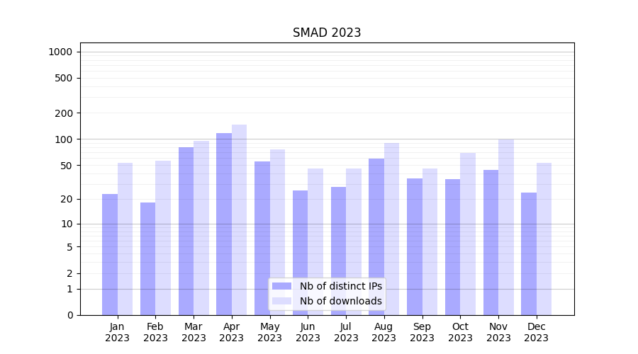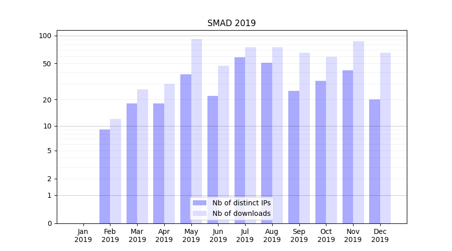 Number of downloads for software package SMAD, year by year, from 2025 back to 2014 (years with no downloads are omitted):