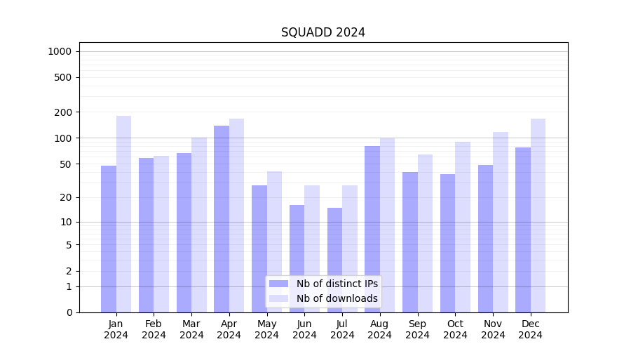 Number of downloads for software package SQUADD, year by year, from 2025 back to 2014 (years with no downloads are omitted):