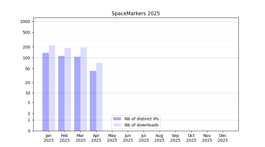 Number of downloads for software package SpaceMarkers, year by year, from 2025 back to 2014 (years with no downloads are omitted):