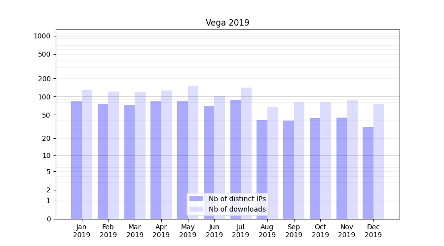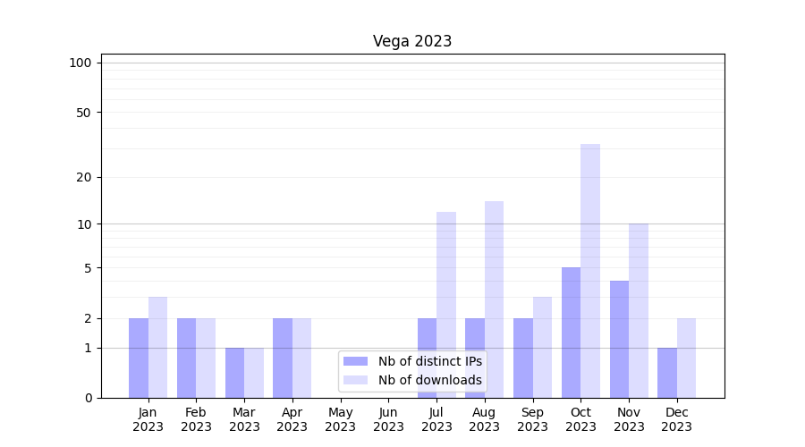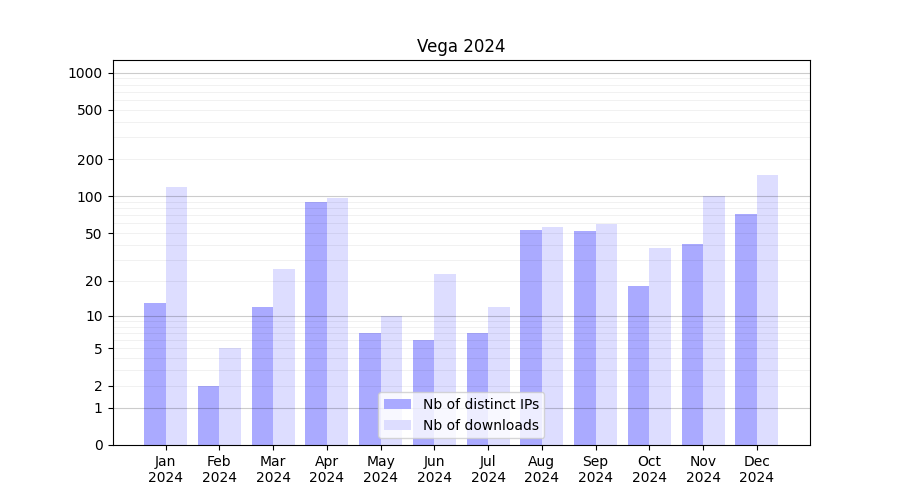 Number of downloads for software package Vega, year by year, from 2025 back to 2014 (years with no downloads are omitted):