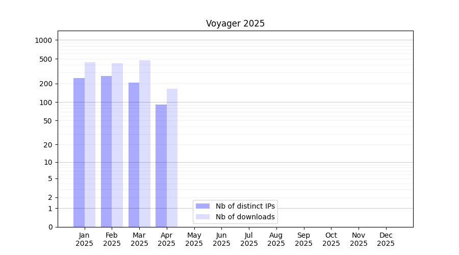 Number of downloads for software package Voyager, year by year, from 2025 back to 2014 (years with no downloads are omitted):