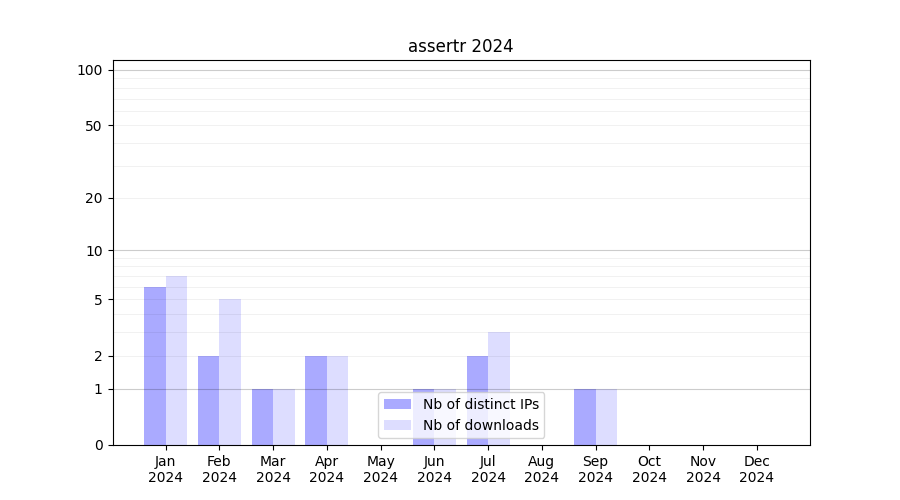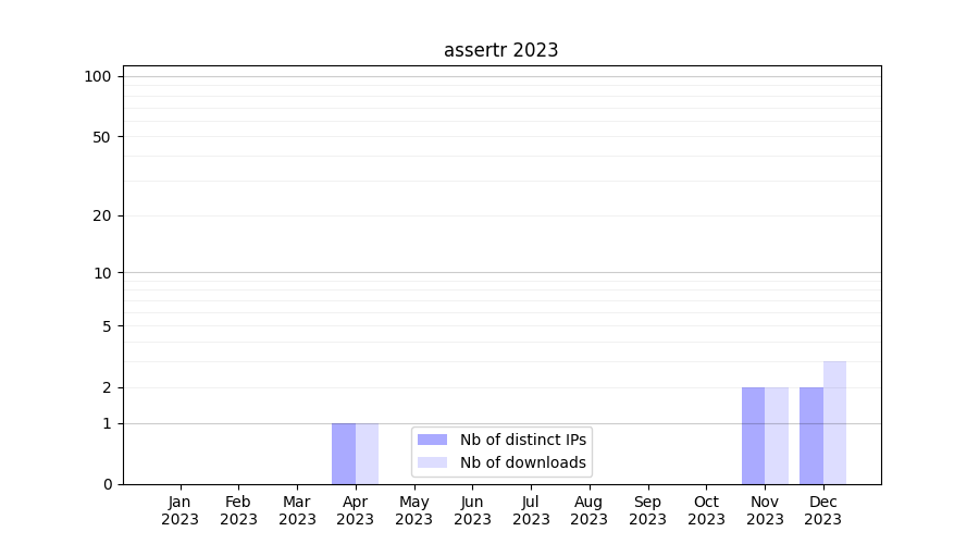 Number of downloads for software package assertr, year by year, from 2025 back to 2014 (years with no downloads are omitted):