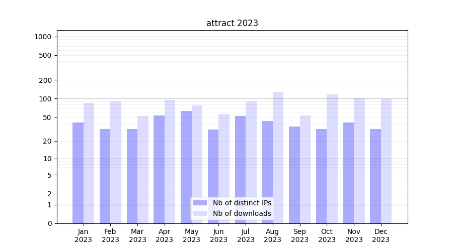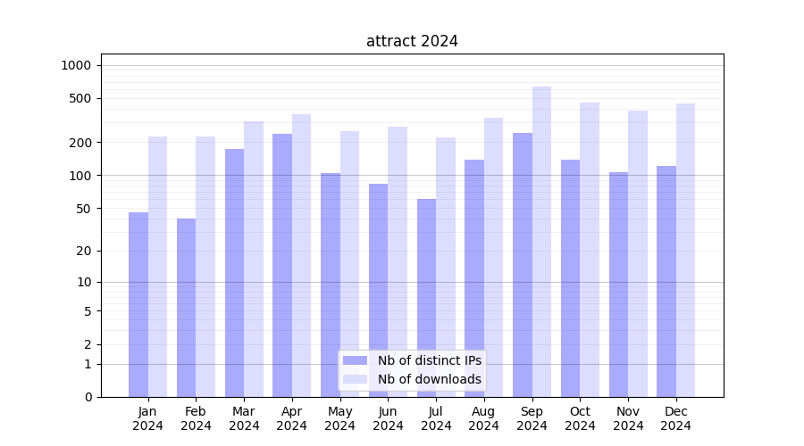 Number of downloads for software package attract, year by year, from 2025 back to 2014 (years with no downloads are omitted):