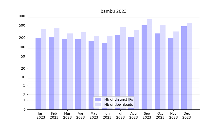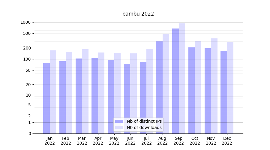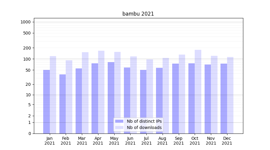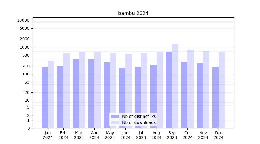 Number of downloads for software package bambu, year by year, from 2025 back to 2014 (years with no downloads are omitted):