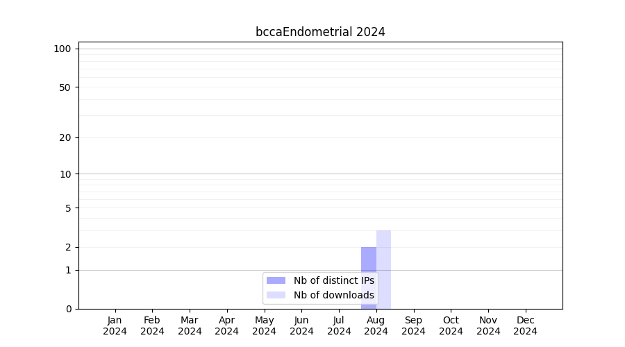 Number of downloads for software package bccaEndometrial, year by year, from 2025 back to 2014 (years with no downloads are omitted):