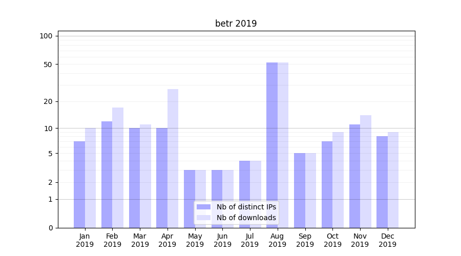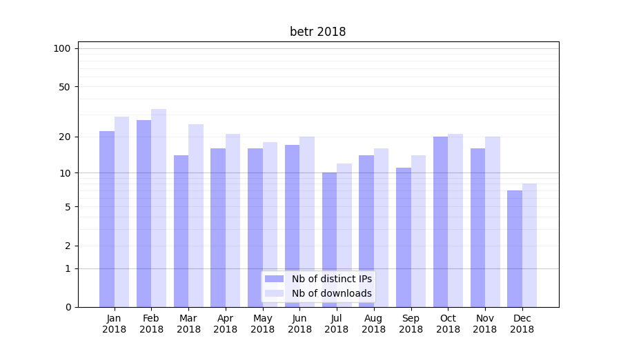 Number of downloads for software package betr, year by year, from 2025 back to 2014 (years with no downloads are omitted):
