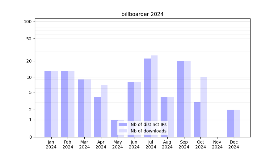 Number of downloads for software package billboarder, year by year, from 2025 back to 2014 (years with no downloads are omitted):