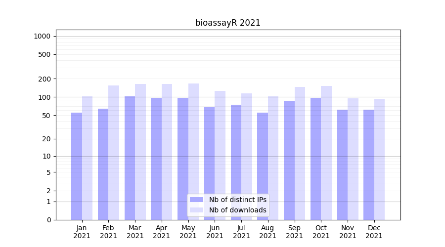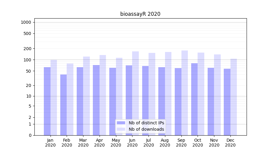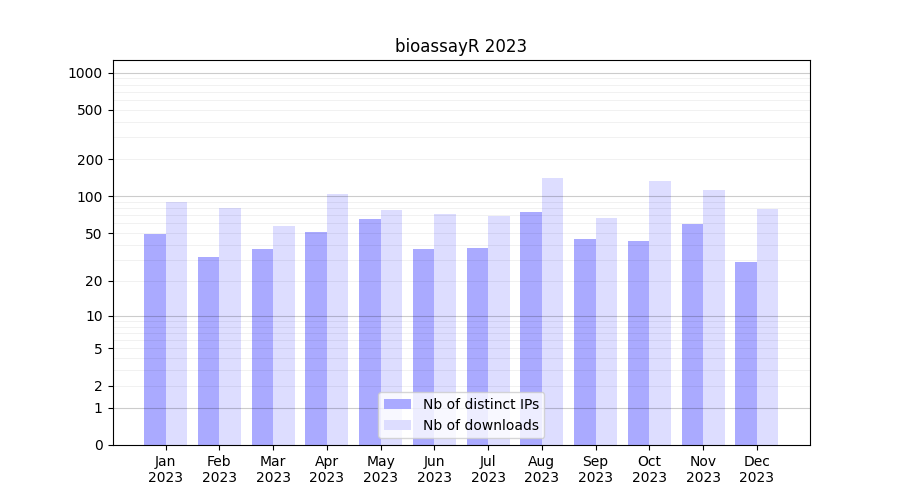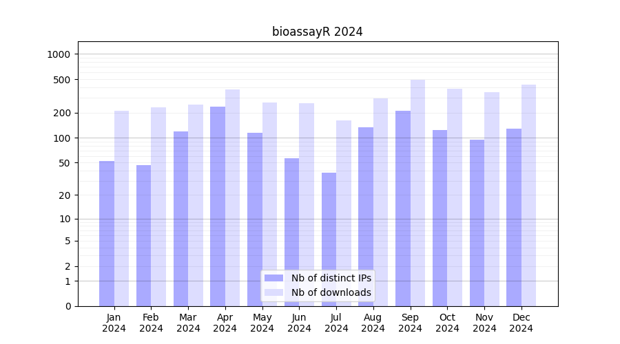 Number of downloads for software package bioassayR, year by year, from 2025 back to 2014 (years with no downloads are omitted):