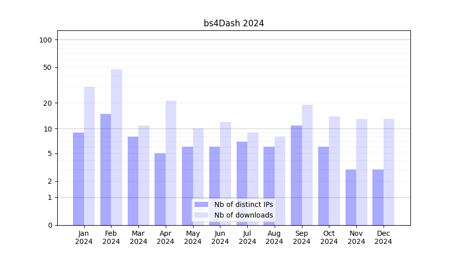Number of downloads for software package bs4Dash, year by year, from 2025 back to 2014 (years with no downloads are omitted):