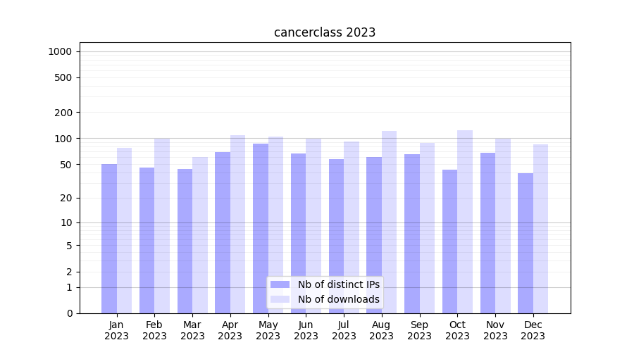 Number of downloads for software package cancerclass, year by year, from 2025 back to 2014 (years with no downloads are omitted):