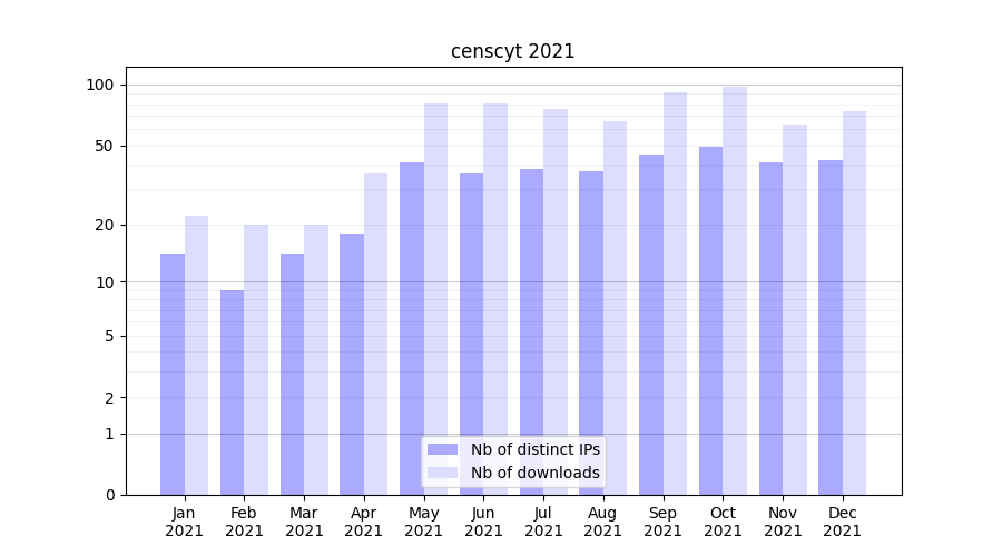 Number of downloads for software package censcyt, year by year, from 2025 back to 2014 (years with no downloads are omitted):