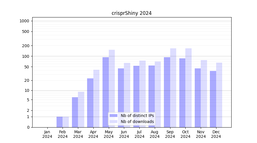 Number of downloads for software package crisprShiny, year by year, from 2025 back to 2014 (years with no downloads are omitted):