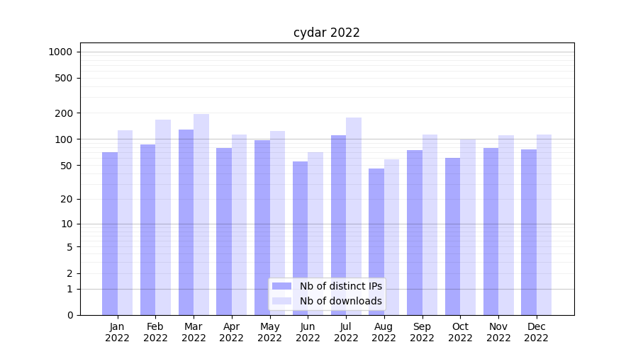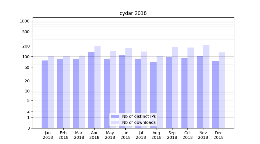 Number of downloads for software package cydar, year by year, from 2025 back to 2014 (years with no downloads are omitted):