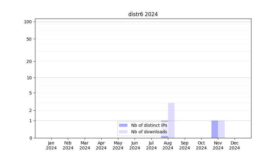 Number of downloads for software package distr6, year by year, from 2025 back to 2014 (years with no downloads are omitted):