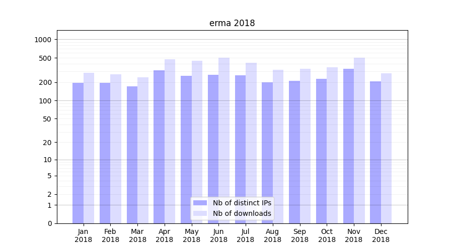 Number of downloads for software package erma, year by year, from 2025 back to 2014 (years with no downloads are omitted):