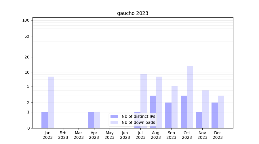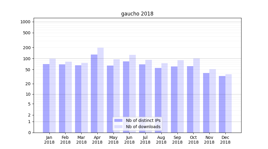 Number of downloads for software package gaucho, year by year, from 2025 back to 2014 (years with no downloads are omitted):
