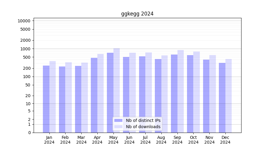 Number of downloads for software package ggkegg, year by year, from 2025 back to 2014 (years with no downloads are omitted):