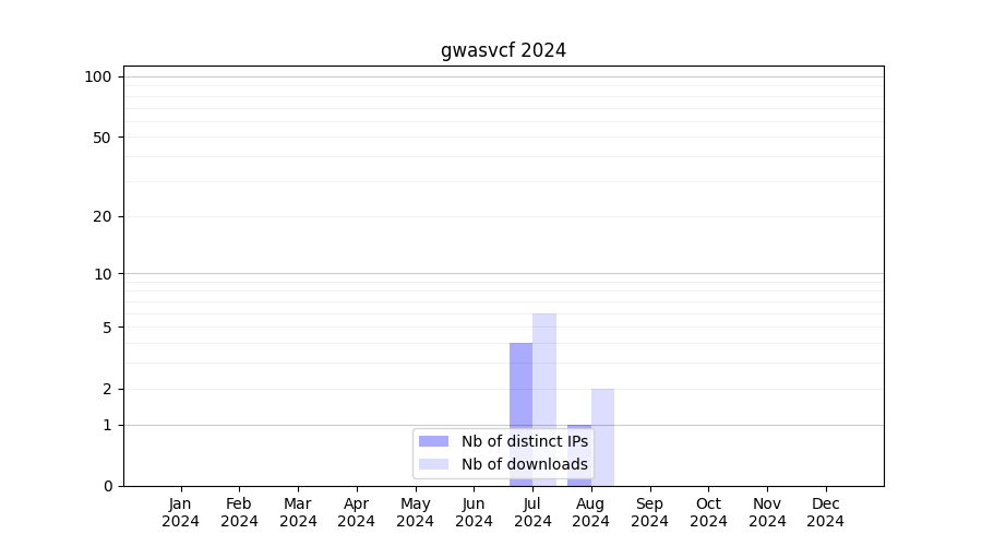 Number of downloads for software package gwasvcf, year by year, from 2025 back to 2014 (years with no downloads are omitted):