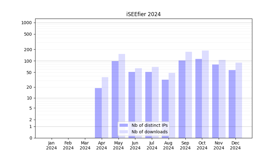 Number of downloads for software package iSEEfier, year by year, from 2025 back to 2014 (years with no downloads are omitted):