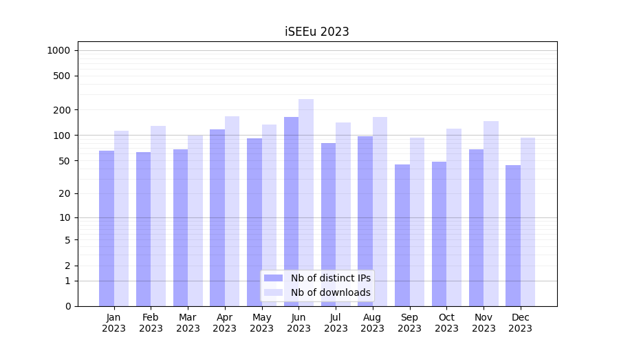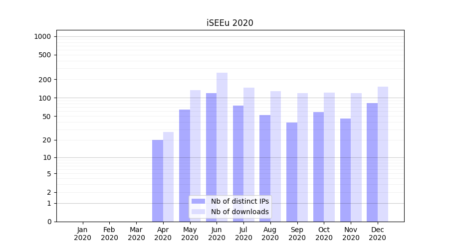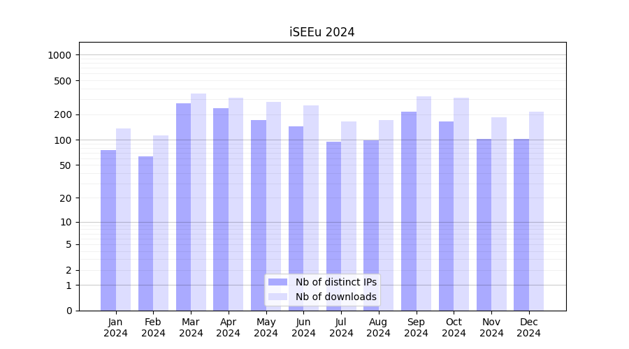 Number of downloads for software package iSEEu, year by year, from 2025 back to 2014 (years with no downloads are omitted):