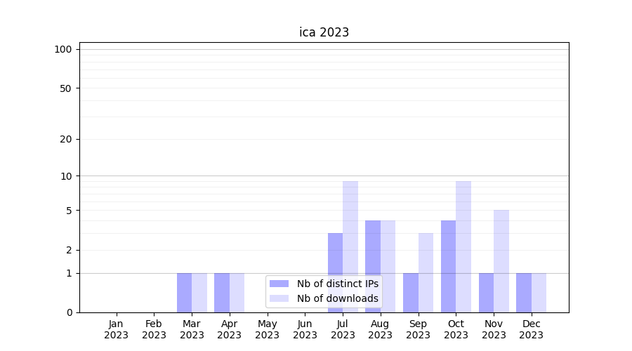 Number of downloads for software package ica, year by year, from 2025 back to 2014 (years with no downloads are omitted):
