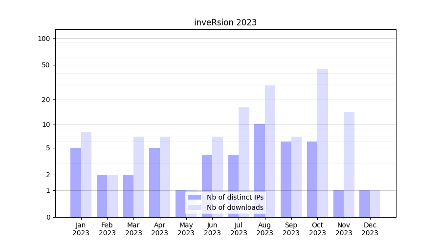 Number of downloads for software package inveRsion, year by year, from 2025 back to 2014 (years with no downloads are omitted):