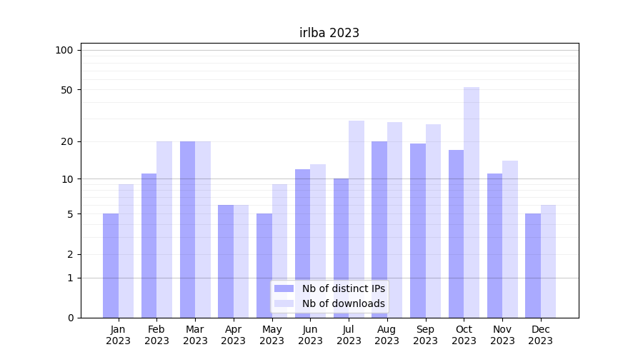 Number of downloads for software package irlba, year by year, from 2025 back to 2014 (years with no downloads are omitted):