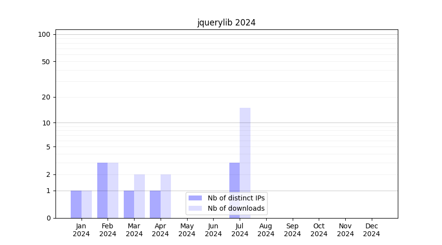 Number of downloads for software package jquerylib, year by year, from 2025 back to 2014 (years with no downloads are omitted):