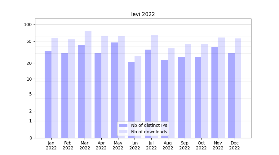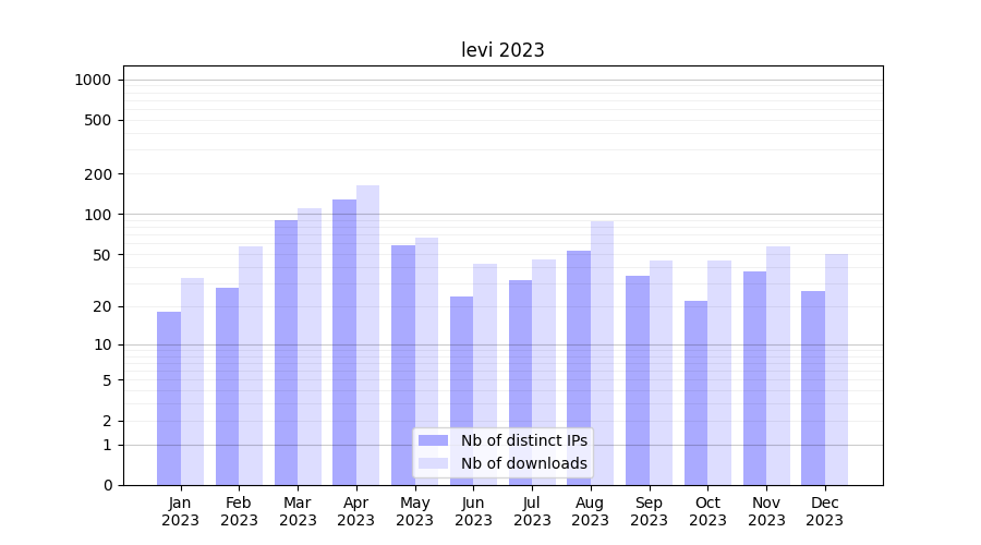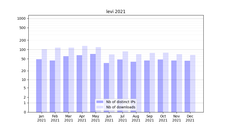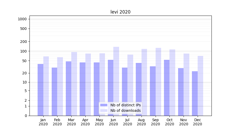 Number of downloads for software package levi, year by year, from 2025 back to 2014 (years with no downloads are omitted):