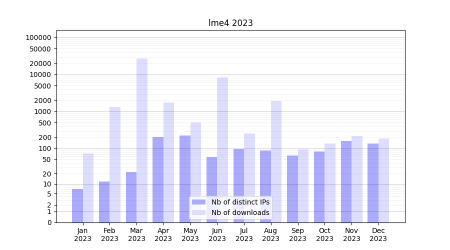Number of downloads for software package lme4, year by year, from 2025 back to 2014 (years with no downloads are omitted):