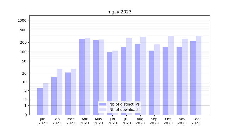 Number of downloads for software package mgcv, year by year, from 2025 back to 2014 (years with no downloads are omitted):