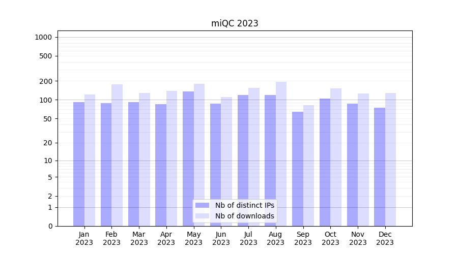 Number of downloads for software package miQC, year by year, from 2025 back to 2014 (years with no downloads are omitted):
