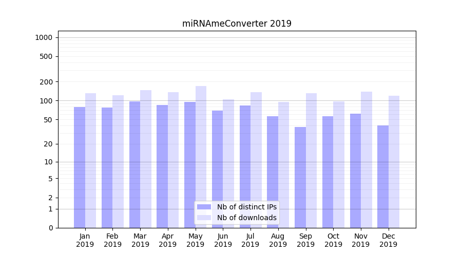 Number of downloads for software package miRNAmeConverter, year by year, from 2025 back to 2014 (years with no downloads are omitted):