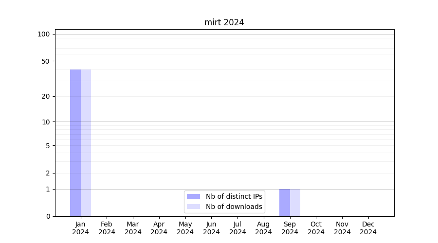 Number of downloads for software package mirt, year by year, from 2025 back to 2014 (years with no downloads are omitted):