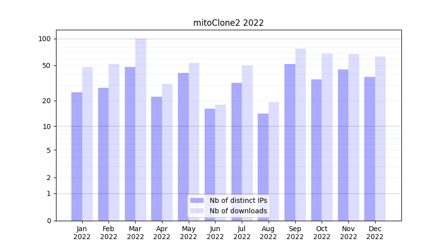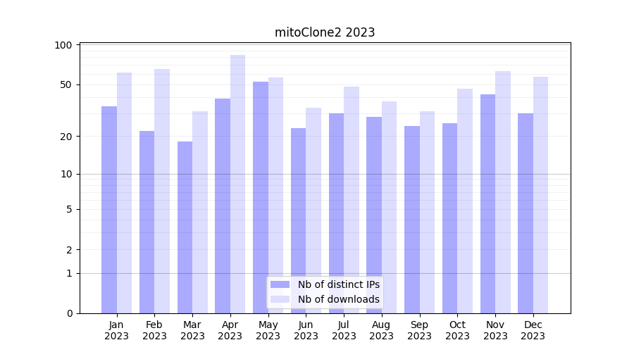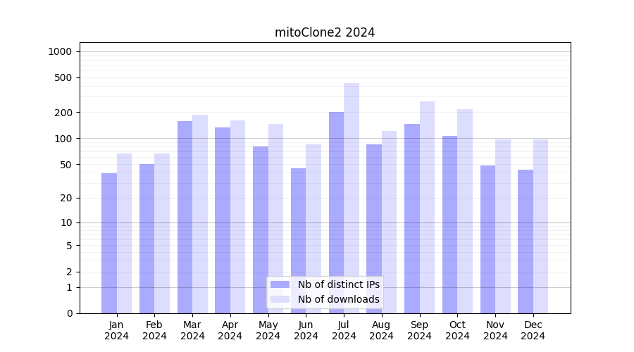 Number of downloads for software package mitoClone2, year by year, from 2025 back to 2014 (years with no downloads are omitted):