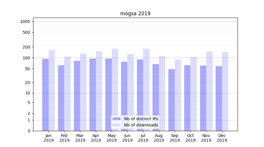 Number of downloads for software package mogsa, year by year, from 2025 back to 2014 (years with no downloads are omitted):