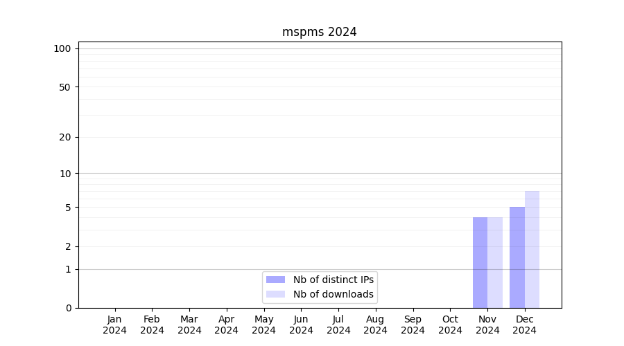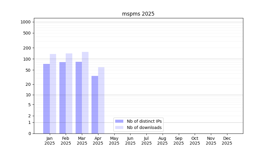 Number of downloads for software package mspms, year by year, from 2025 back to 2014 (years with no downloads are omitted):
