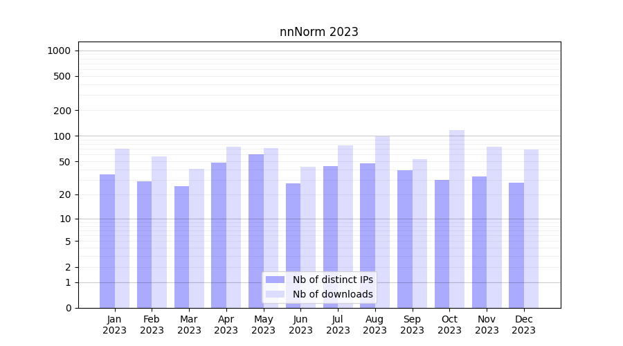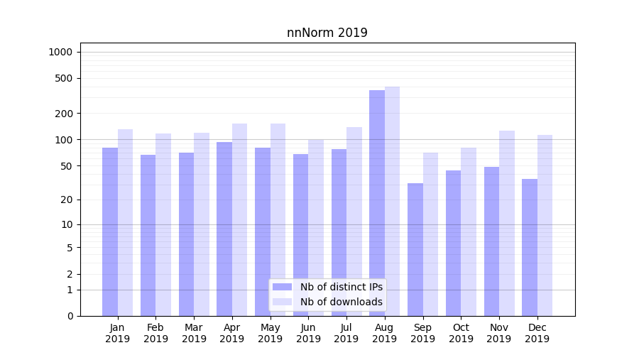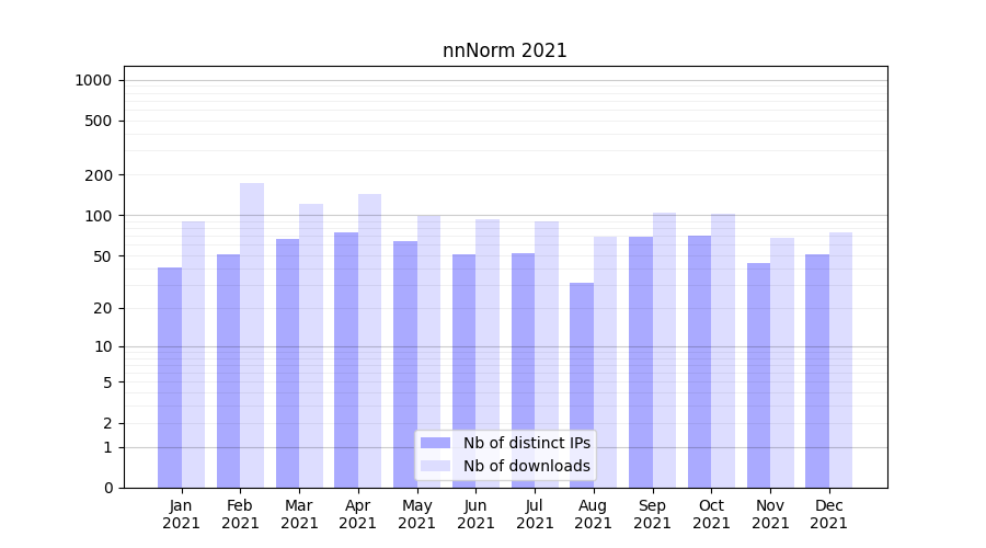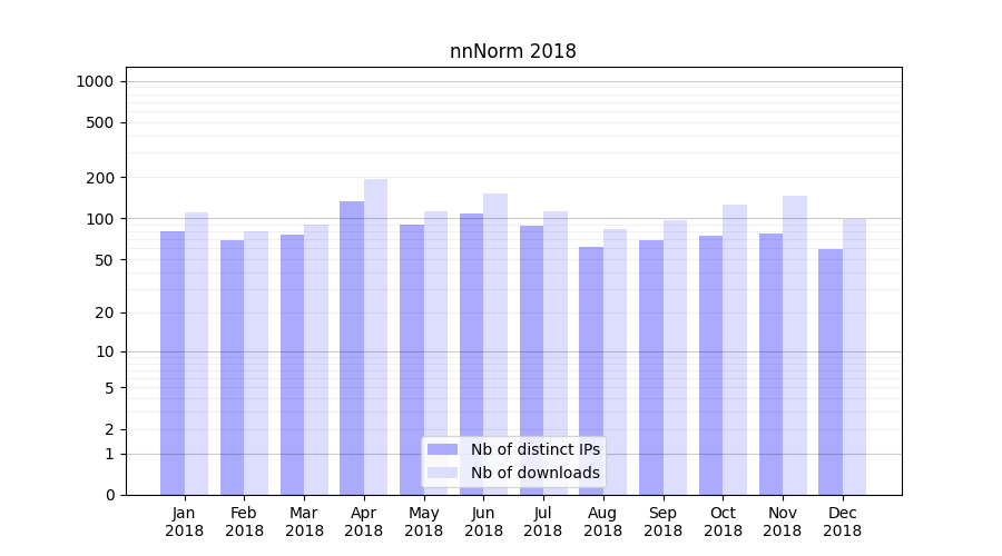 Number of downloads for software package nnNorm, year by year, from 2025 back to 2014 (years with no downloads are omitted):