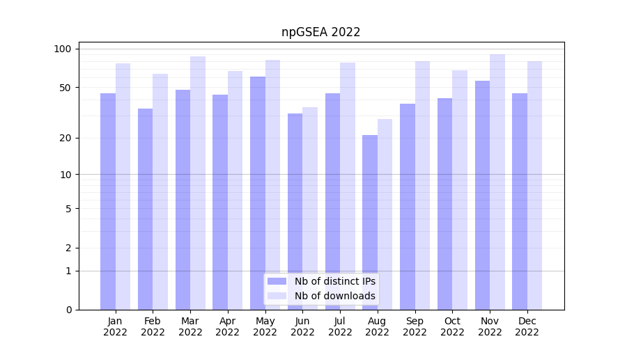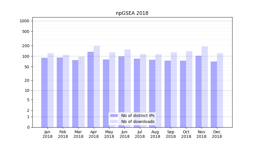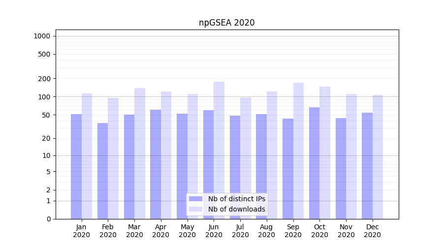 Number of downloads for software package npGSEA, year by year, from 2025 back to 2014 (years with no downloads are omitted):