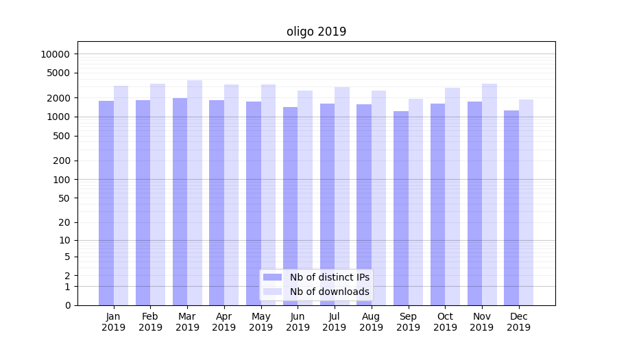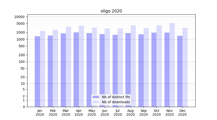 Number of downloads for software package oligo, year by year, from 2025 back to 2014 (years with no downloads are omitted):