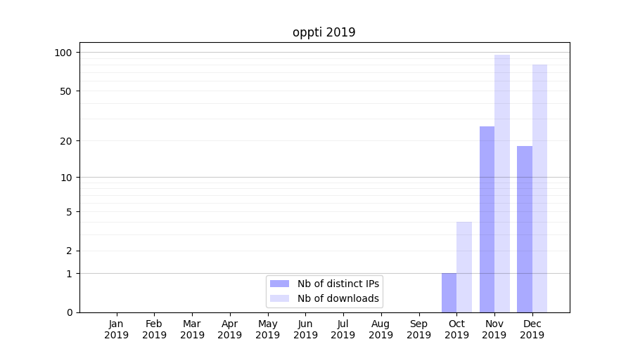 Number of downloads for software package oppti, year by year, from 2025 back to 2014 (years with no downloads are omitted):