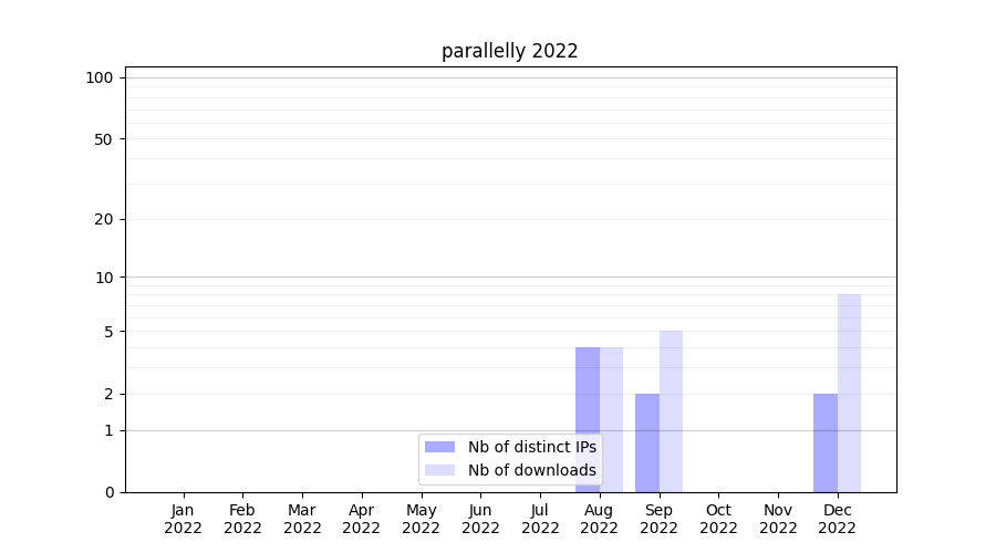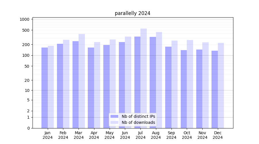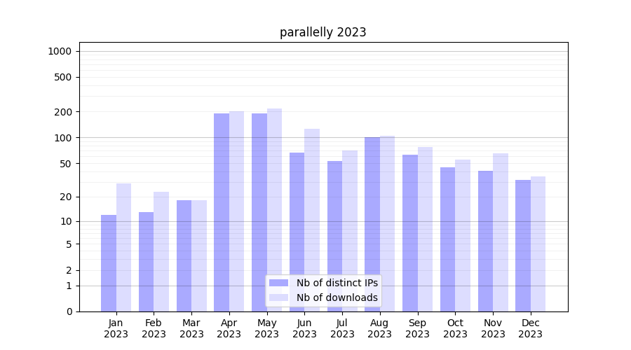 Number of downloads for software package parallelly, year by year, from 2025 back to 2014 (years with no downloads are omitted):