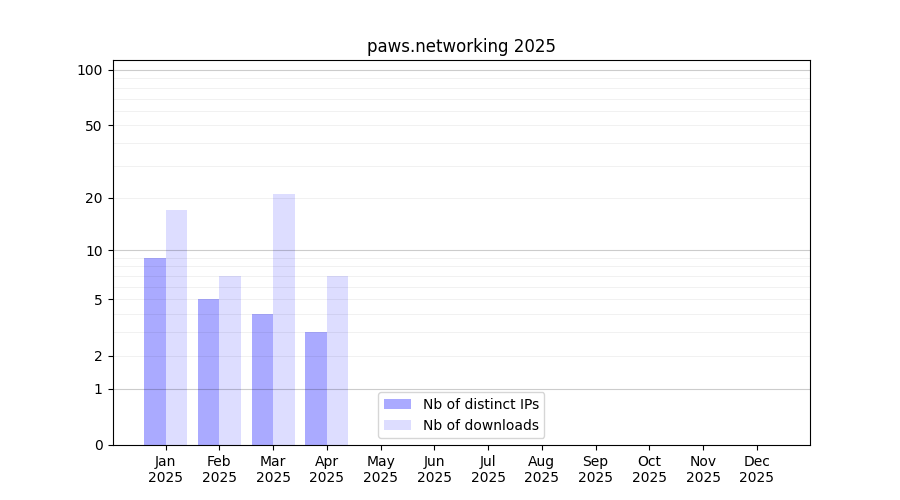 Number of downloads for software package paws.networking, year by year, from 2025 back to 2014 (years with no downloads are omitted):