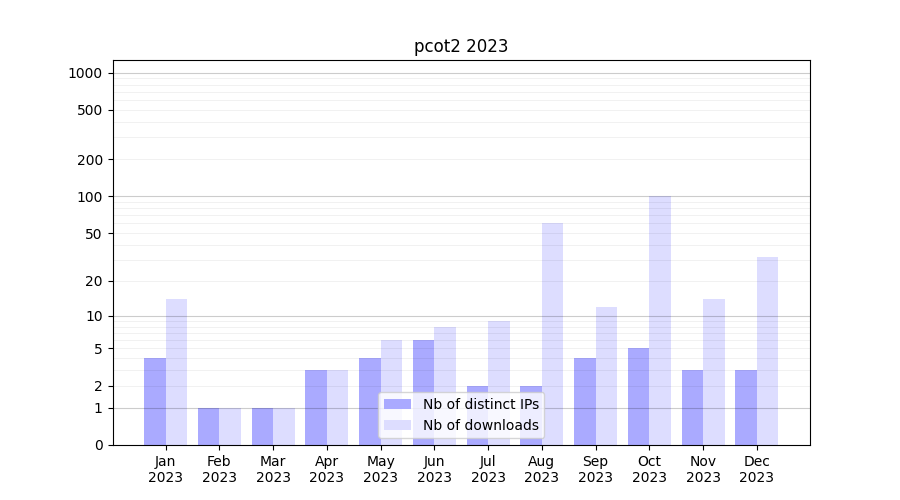 Number of downloads for software package pcot2, year by year, from 2025 back to 2014 (years with no downloads are omitted):