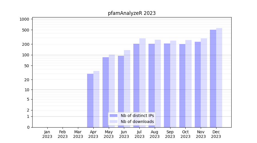 Number of downloads for software package pfamAnalyzeR, year by year, from 2025 back to 2014 (years with no downloads are omitted):