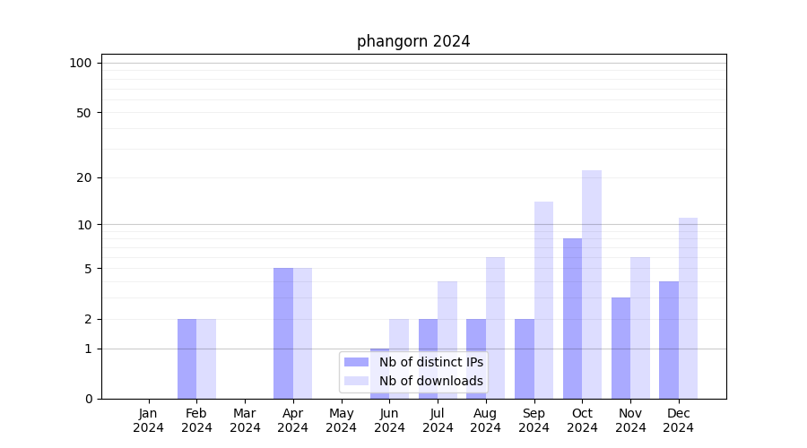 Number of downloads for software package phangorn, year by year, from 2025 back to 2014 (years with no downloads are omitted):