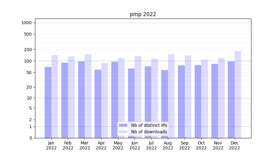 Number of downloads for software package pmp, year by year, from 2025 back to 2014 (years with no downloads are omitted):