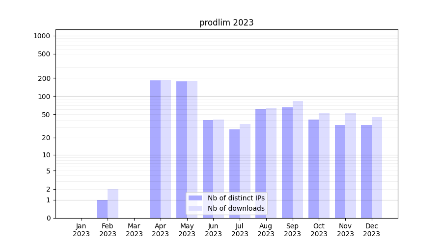 Number of downloads for software package prodlim, year by year, from 2025 back to 2014 (years with no downloads are omitted):