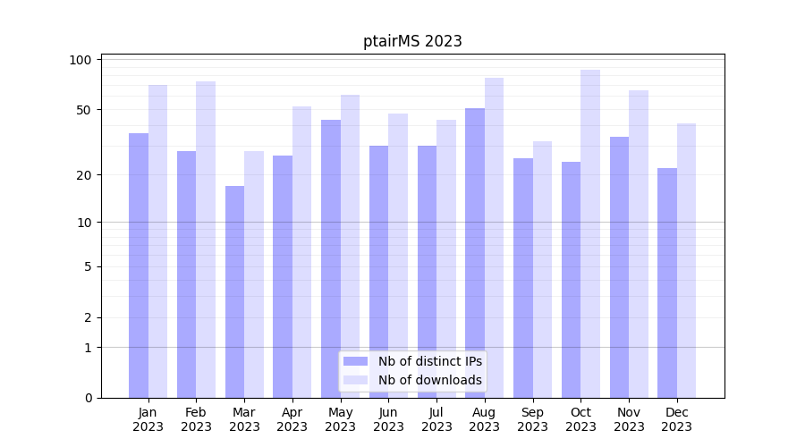 Number of downloads for software package ptairMS, year by year, from 2025 back to 2014 (years with no downloads are omitted):