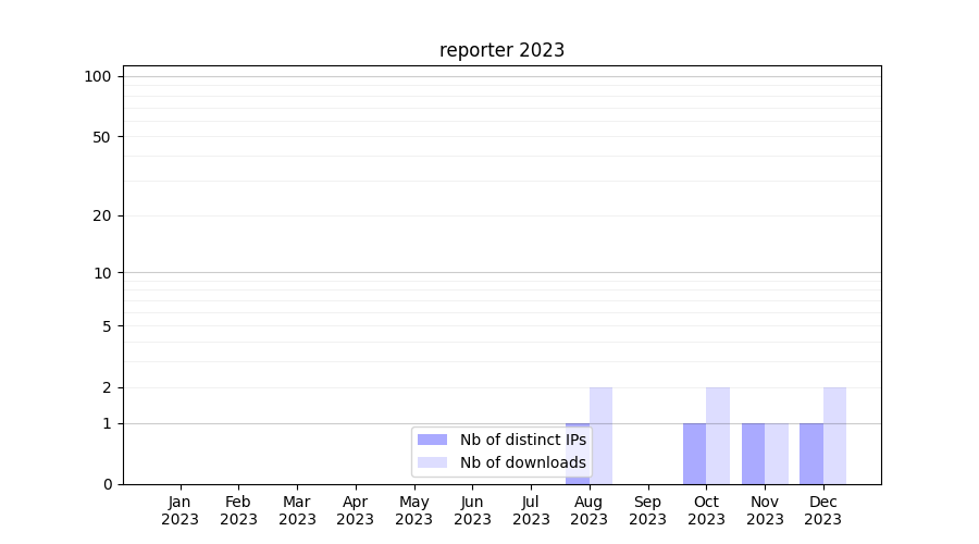Number of downloads for software package reporter, year by year, from 2025 back to 2014 (years with no downloads are omitted):